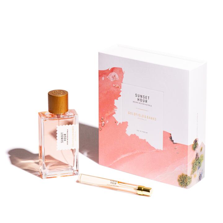 Sunset Hour Christmas Limited Edition Set includes a 100ml Sunset Hour perfume with a complimentary matching 10ml Travel Spray. As a blazing sun dips into the Indian Ocean, the scent of fragrant native fruit pervades the languorous evening breeze. A heavenly elixir of citrus and spicy delights awaits, giving way to a deliciously gourmand and sensuous floral heart. Best served at sunset hour! Concentration: Eau De Pafume All our perfumes have a concentration of +/- 20% essences and are tested under extreme humid weather conditions. Botanicals & Essences Mandarin Italy Desert Peach Australia (Quandong) Raspberry Jasmin Sambac Absolute Ginger Nigeria Pink Pepper Madagascar Sandalwood Australia Cashmere Wood Benzoin Laos Olfactory Description Juicy Delicious Spicy Joyful
